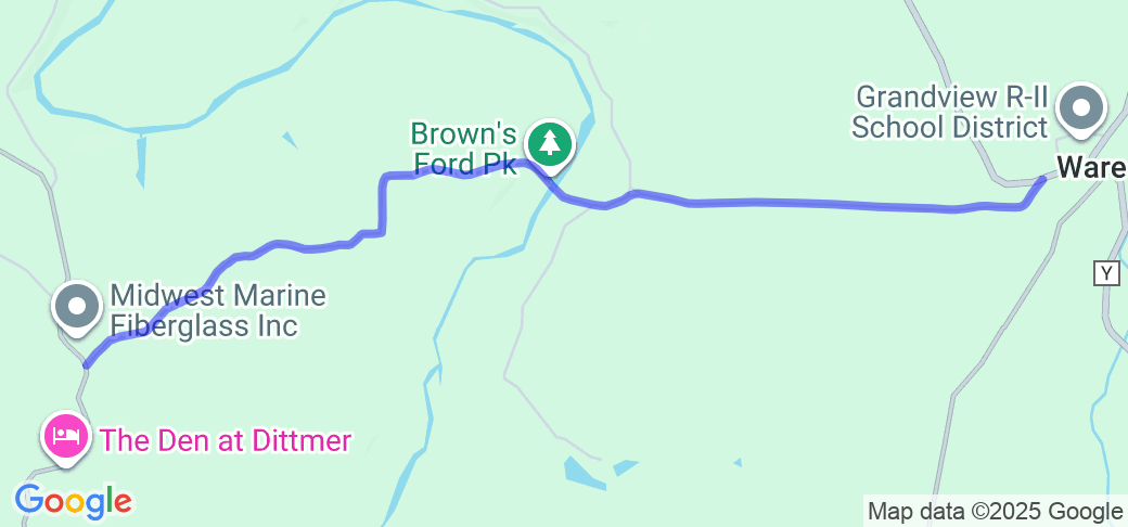 From De Soto, MO, take Hwy Y from MO-21 for approximately 7 miles, to the intersection with Brown's Ford Road (just past Grandview High School). Turn slightly left onto Brown's Ford Road (the beginning of the route), and follow the road for approximately 4.7 miles, to the intersection with Hwy WW (the end of the route). You can take Hwy WW north to MO-30 or south to Hwy H.