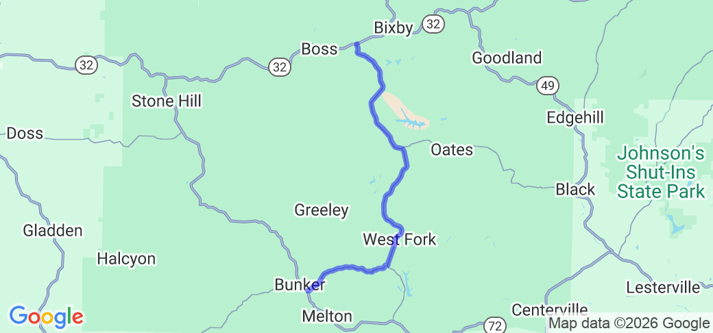 From Bixby, MO, travel approximately 2.5 miles west on MO-32 to the intersection with Hwy KK. Turn left (south) onto Hwy KK and continue for 15 miles, to the intersection with Hwy TT. Turn right to continue on Hwy KK for another 5 miles, to the intersection with MO-72 on the south edge of Bunker, MO.