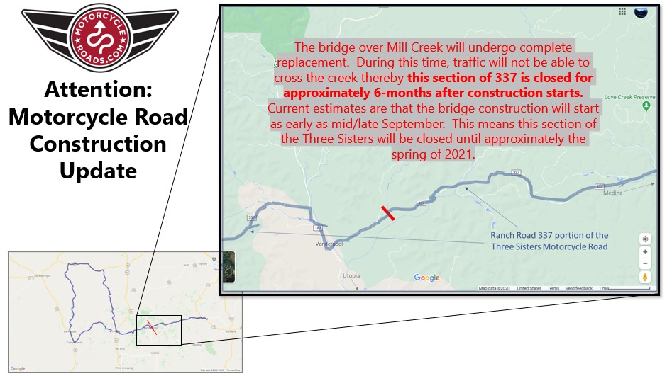 Unfortunately road construction along a portion of the route will completely block a section of the route and so this article is designed to help riders plan appropriately. According the blog of the Black Bucket Lodge in Median Texas, a bridge crossing Mill Creak will be completely shut down while it is rebuilt and so a portion of Ranch Road 337 will become impassable to traffic. This construction could start as early as mid Sep, 2020 and once it starts, it is estimated to take 6-months to complete. As you can see in the graphic below, this will make block one of the three Ranch Roads making up the Three Sisters, yet the other two ranch roads are not affected by this construction.