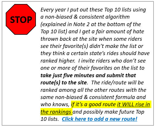 So, with all that summary information behind us, let’s jump right in to the listing of the Top 10 Best Motorcycle Rides in the South and I’ll try to eek out just a bit more suspense by starting the list in reverse at the #10 ranked motorcycle ride and working my way to #1 ride: