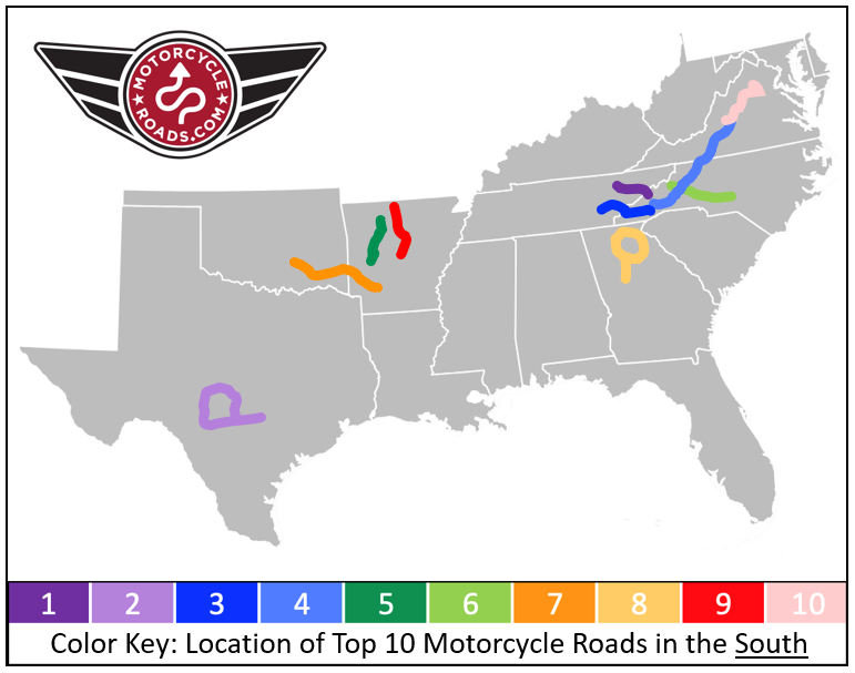 After explaining all that, here is the map of the Top 10 Motorcycle Rides in the South. Follow the color key below to show you where the best motorcycle rides in the south are located!