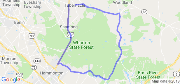 Follow State Route 532 east from Conte Farms in Tabernacle, NJ. The quiet country road is essentially a loop formed by State Routes 563, 542, 206, and 532. This 51-mile route follows a peaceful rural road with beautiful sights and gentle curves.