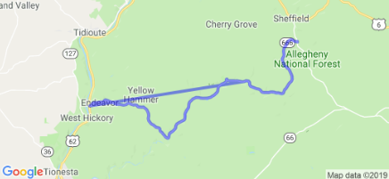 This 30-mile motorcycle ride is situated in the heart of the Allegheny National Forest begins in E. Hickory, PA, passes through Kingsley and Howe, and ends at Barnes, Pennsylvania. It has small bridges, creek beds, and majestic rock formations.