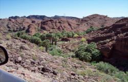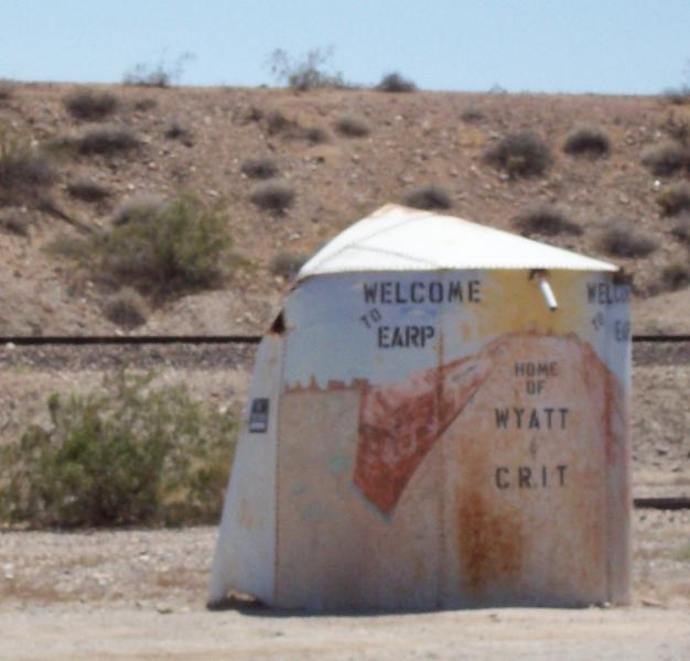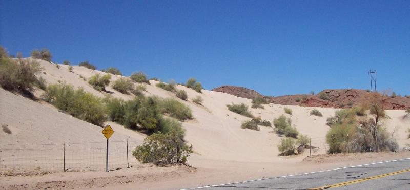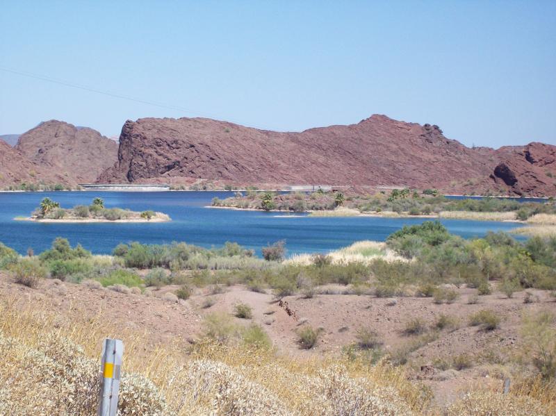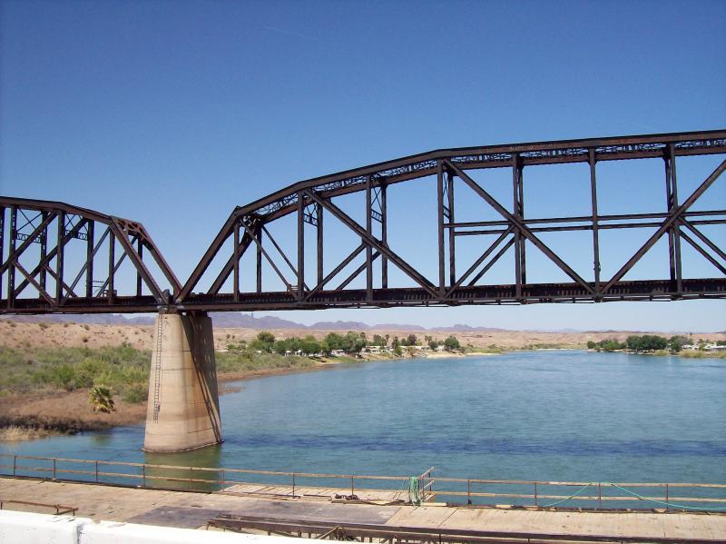 Due to numerous dams, the Colorado River is always wide and relatively slow which makes it ideal for recreation. This route circles a popular area for various water sports. The crossing over the river on the auto route is parallel to the picturesque railroad bridge. Immediately on the California side is the location of Earp, CA, named after the famous lawman, Wyatt Earp. He had many mining claims in this area along with the only permanent home he ever actually owned. None of his stuff is around now, however.