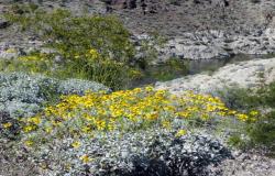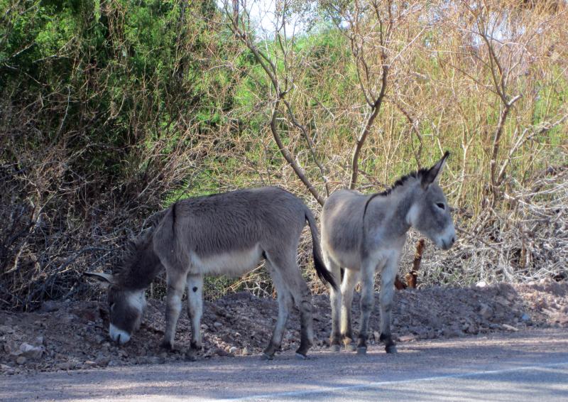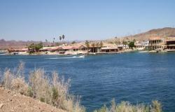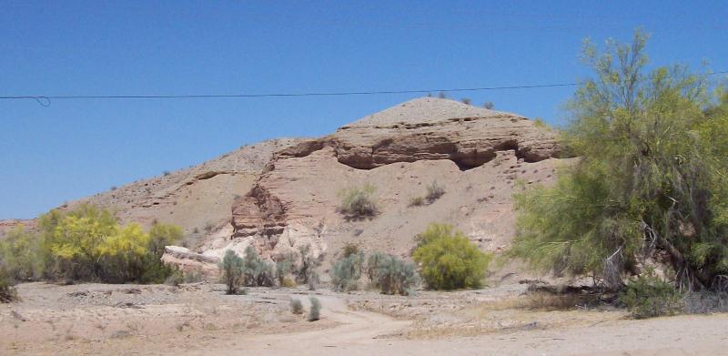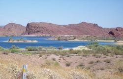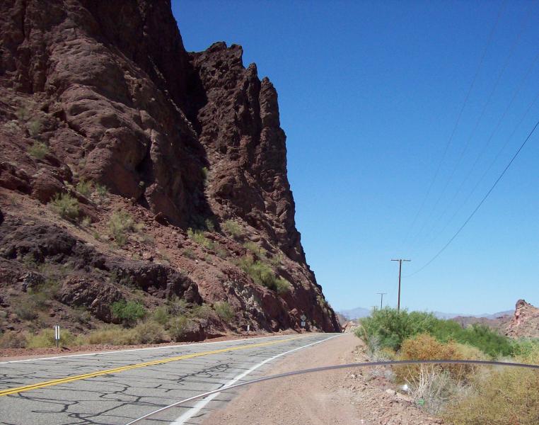 As you proceed along the river, you will see sedimentary rock mostly, left by ancient lakes and streams. This soon turns into more jagged and prominent basalt from old lava flows. Some of these hills go straight up from the roadway. You will have views of the vacation homes along the river, mostly on the Arizona side. The California side is primarily r.v. parks. Along here, wild burros are frequently wandering around.