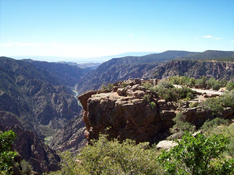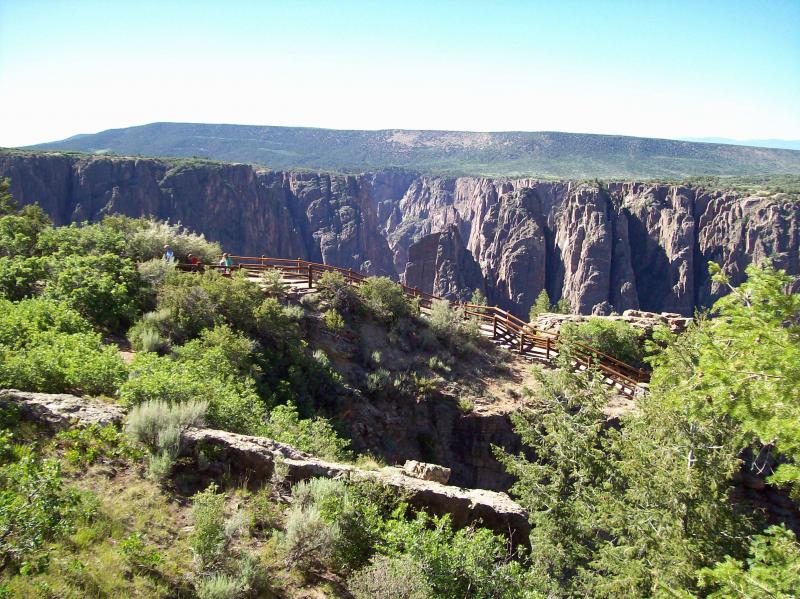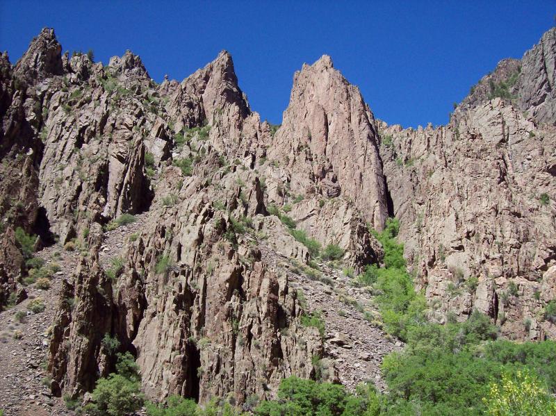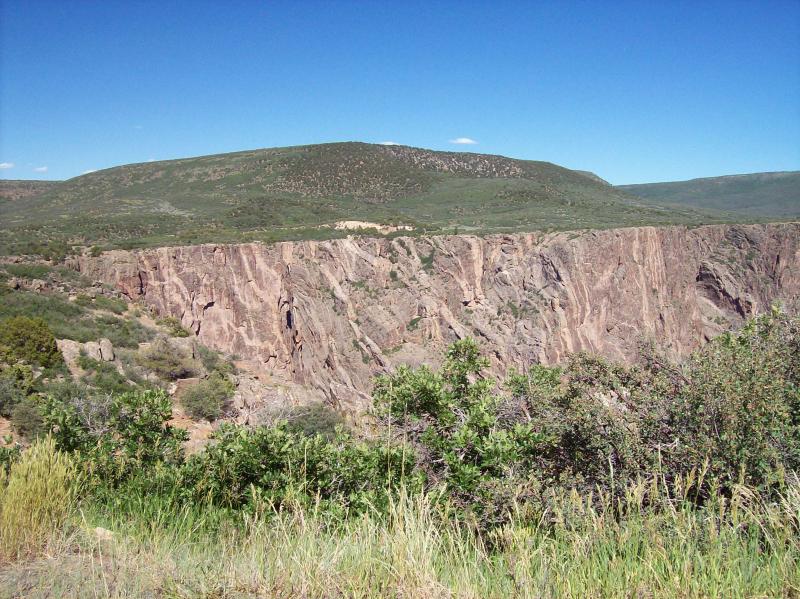 You start your trip from ranch land in the lower valley out of Montrose where you will pass through some pinion/juniper forest. Most of these trees are less than 20' high, which is normal for semi-arid land. As you approach the park at about 8300', you come into more Gamble oak and mountain mahogany bushes up to about 10'. This is also the vegetation along the rim. Dropping down by the Gunnison River, the vegetation changes to taller conifer trees and many healthy broadleaf deciduous trees that are benefited by the cooler, moisture air and water from the river.