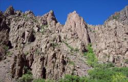 In the past, the river cut through softer volcanic rock from nearby eruptions that flowed over the area. Then it cut through harder crystalline rock, especially forceful before the upstream dams that are now present. Along the walls are tremendous displays of intrusions, which were formed by hot volcanic magma being forced up through cracks in rock above it. Now they look like colored lines printed on the opposing sheer rock walls.