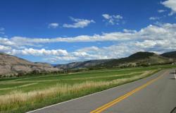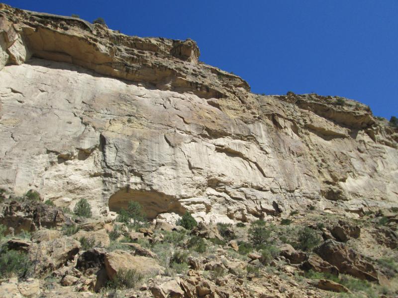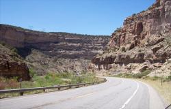 As you leave the Colorado River canyon, you will ride along Plateau Creek in a narrow canyon of colorful sandstone layers. The walls of tan rock alongside are often 1200' straight up. The vegetation is sparse, semi-arid bushes, even along the perennial creek. After 10 miles, the canyon opens up to a narrow valley with small scale ranch land. This creek level area has lush grasses giving this stretch many shades of green. Along here is considerable vegetation on the south bank along the road as water seeps through the ground from an irrigation canal above. Note: be on the alert for deer that cross the road at all times of the day.