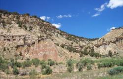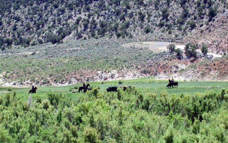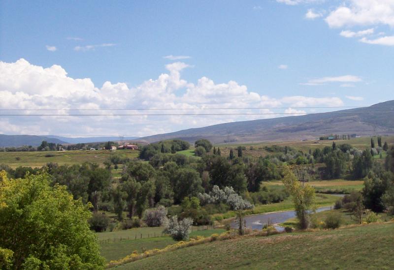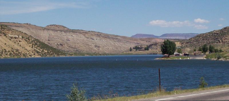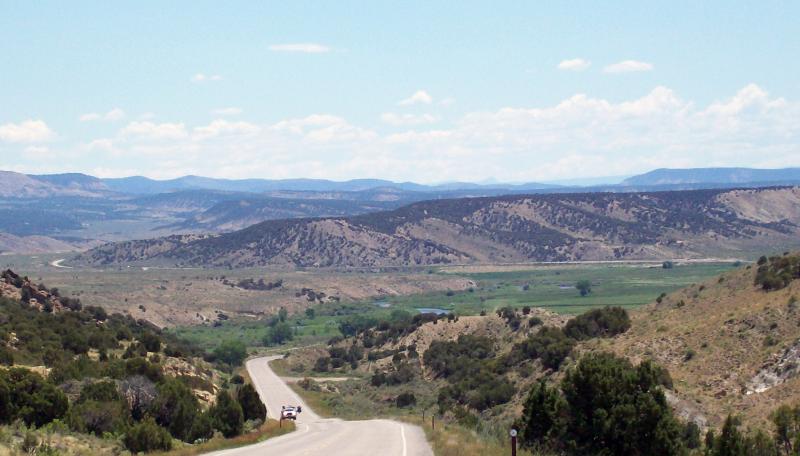 The entire distance is either semi-arid brush country, or lush grass and trees along the White River. The river runs all year and with all the meanders, often covers wide stretches of irrigated river bottom. There is some cattle grazing throughout, but the low land is heavily into hay harvesting, after which is used for cattle grazing. The ranches in this area are strictly small size, working, low investment types and fancy spreads are non-existent. It is pleasing to see the contrast in either green by the river or tan where there is no irrigation. Just out of Rangely is a small reservoir used for recreation and with restrooms and picnic tables.