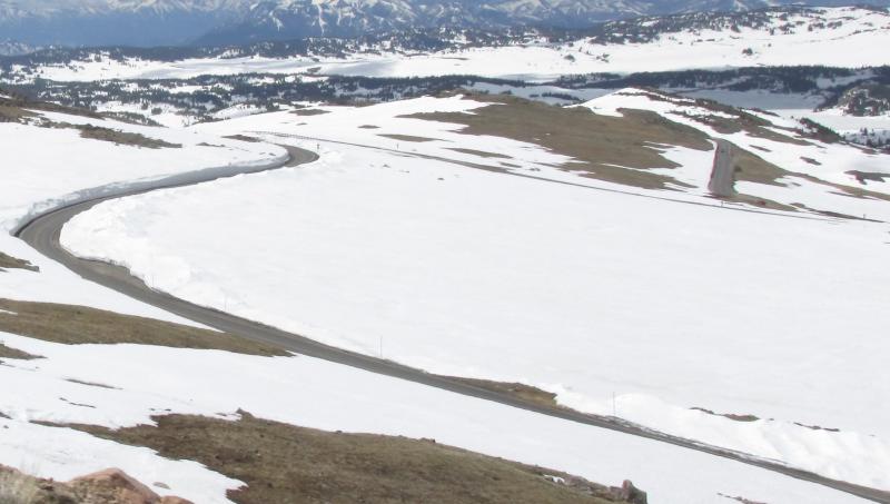 This road will curl your hair. Lotsa UP and DOWN, little guardrails, awesome scenery. You couldn't build a better route than this one! Expect to see as many bikes on this road as cars! Everything from incredible mountains, dense forest, rivers, rocks to snow and tundra. And a whole lot of "straight down"!. Photo contributed by visitor in May 09: "Beartooth Pass In August 2008."