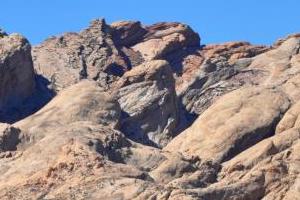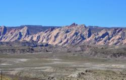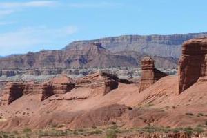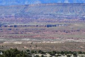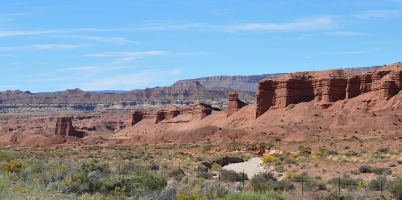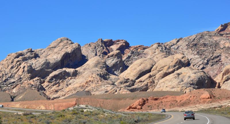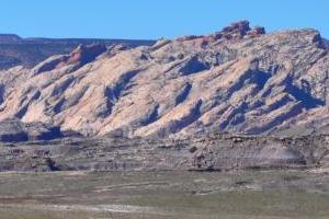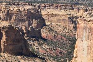 Along I-70 you will see varied close-up views of tan and purple sandstone layers of sedimentary rock. This route is a wonderful ride traveling across the San Rafael Swell-a raised up jumble of many types of layered rock formations with fantastic views of long valleys crossing your path. The sparse vegetation is scattered pinyon/juniper trees with roadsides thick with yellow-flowered rabbitbrush. At several points, you can see tremendous views of higher peaks. Some of the narrow canyons you'll cross are barely wide enough for walking, but hundreds of feet deep.