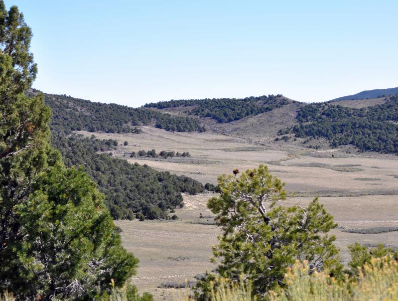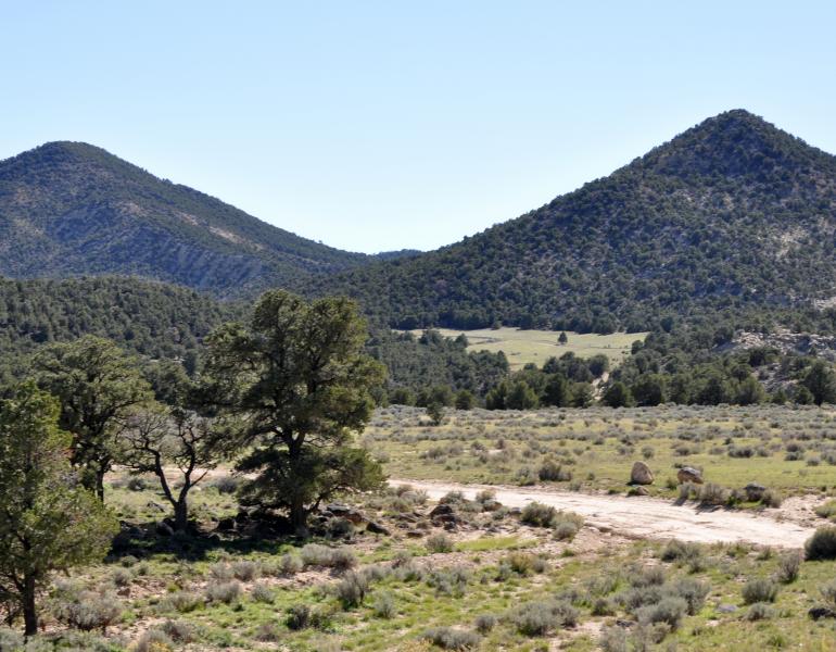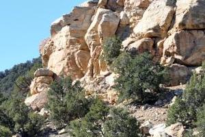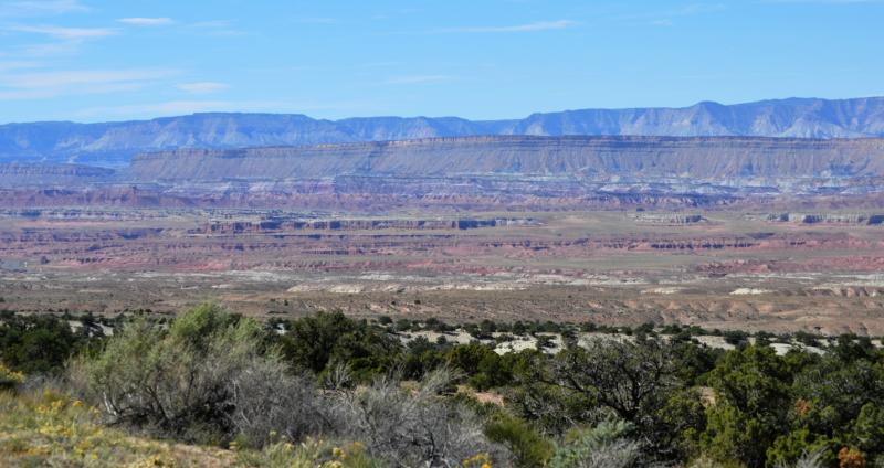 This is a mountain route starting at Loa (elevation 7,064') with the usual desert brush wherever there is no irrigated ranchland. Then on the lower slopes are semi-arid trees like Utah juniper, pinyon and scrub live oak. Higher elevations have the beautiful Ponderosa pine along with aspen groves. Peeking out along the way are hints of buried layers of horizontal rock layers. This mountainous route continues all the way to I-70.