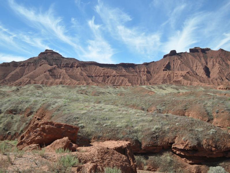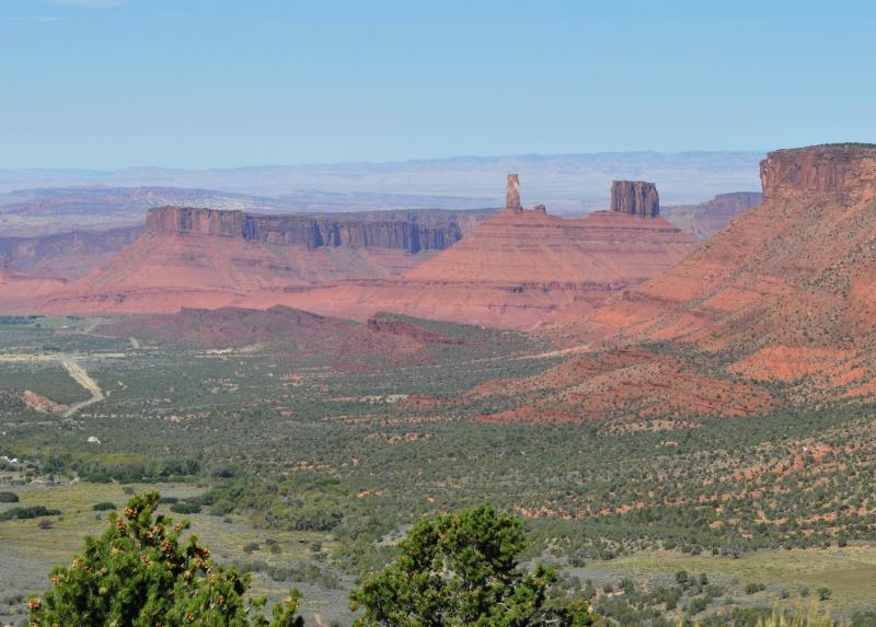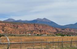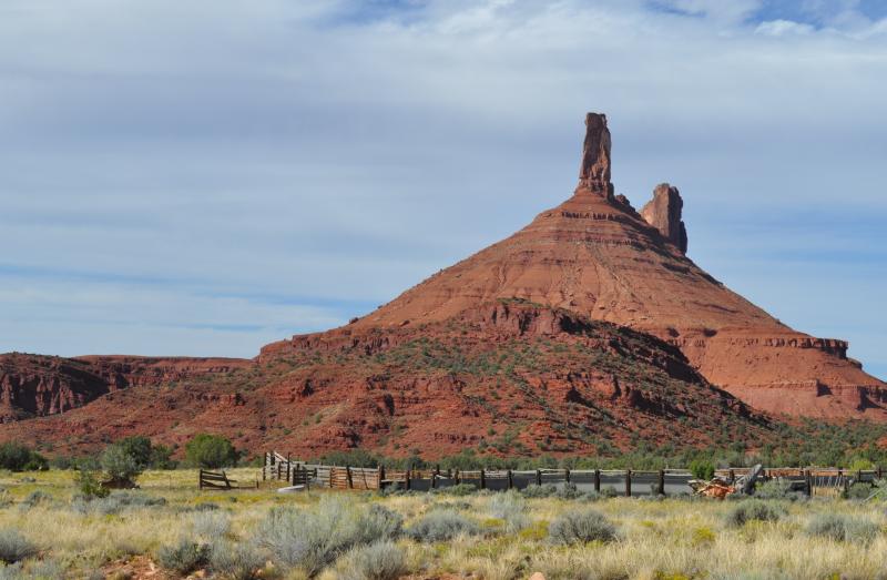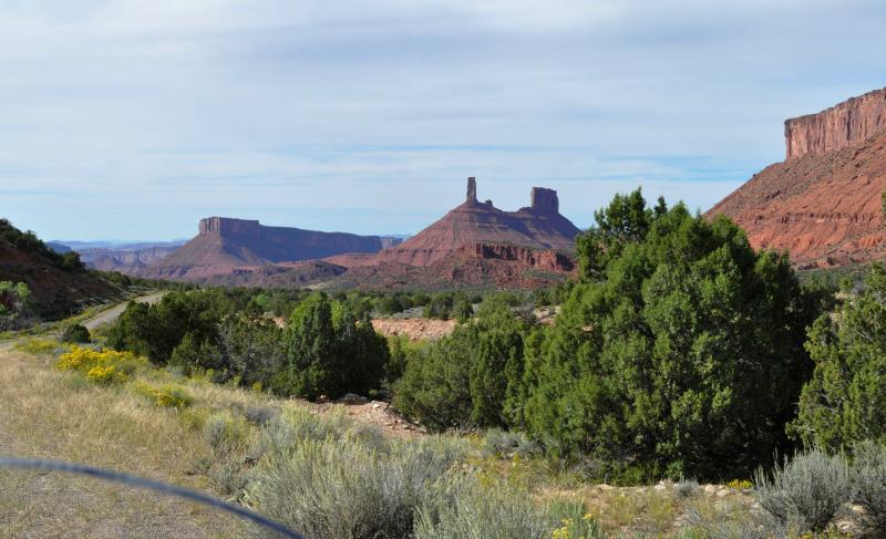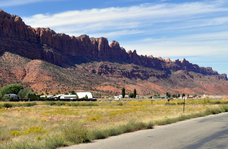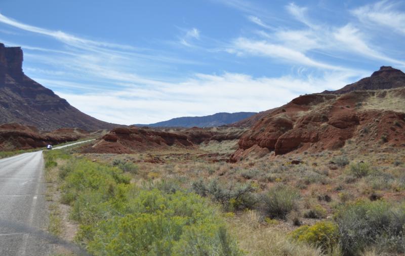 You will have a straight-on view of the La Sal Mountains which rise up to 12,721' on Mt. Peale. The mountains are pointed igneous rock, which comes from molten rock, as opposed to the flat topped rocks all along your route through Castle Valley which is sedimentary rock created by layers of eroded rock and then compressed.