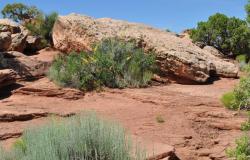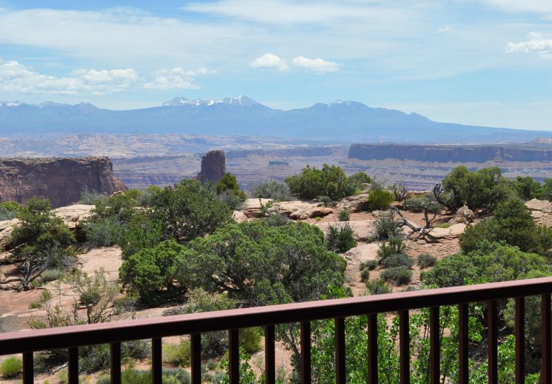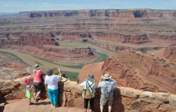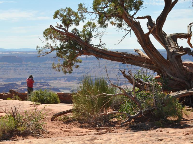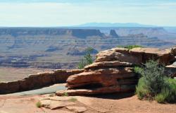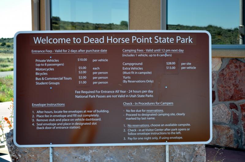 Legend has it that 150 years ago cowboys rounded up a number of wild mustangs and after herding them to the point, fenced off any escape for them on a narrow 30 yard wide approach to the point. Later they retrieved some of the mustangs, but left the rest. Without water, they soon perished. It is definitely high plateau (6,000') desert country with less than 10" of rain per year. You can see it in the plants which are all small leaved with a waxy surface to retard evaporation. The animals restrict their movement to times of cool or at night. So while you may want to walk along some of the 8 miles of hiking trail, or utilize some of the bicycle trails, you can just walk along the main view point and see a spectacular view. I mean spectacular! You will be amazed of seeing the meandering Colorado River 2,000' below. You can see a panorama of layers of sedimentary rock displaying their vivid colors as they lay one on top of another. Sedimentary rock erodes in a vertical manner, so the multitude of distant cliffs are all laid out with their sheer drops. Occasionally the rock is punctuated by rare pockets of vegetation eking out a precarious life on narrow level ledges. Occasionally a raven or hawk may be flying by. The visitor center has some displays of plants, animals, and descriptions of the geology. They even have info for geocaching within the park. This area has been the location of a lot of films. Adventures of Joe Dirt (1999), Touched By an Angel (2001), Austin Powers 3 (2003), John Carter (2010), are just some of them. In 1975 I watched some of Against a Crooked Sky (w/ Richard Boone) being filmed and in 2009 watched some of The Canyon (w/ Will Patton) being filmed nearby. The entrance fee is $5., as this is not a federal park so the Golden Eagle pass doesn't work.